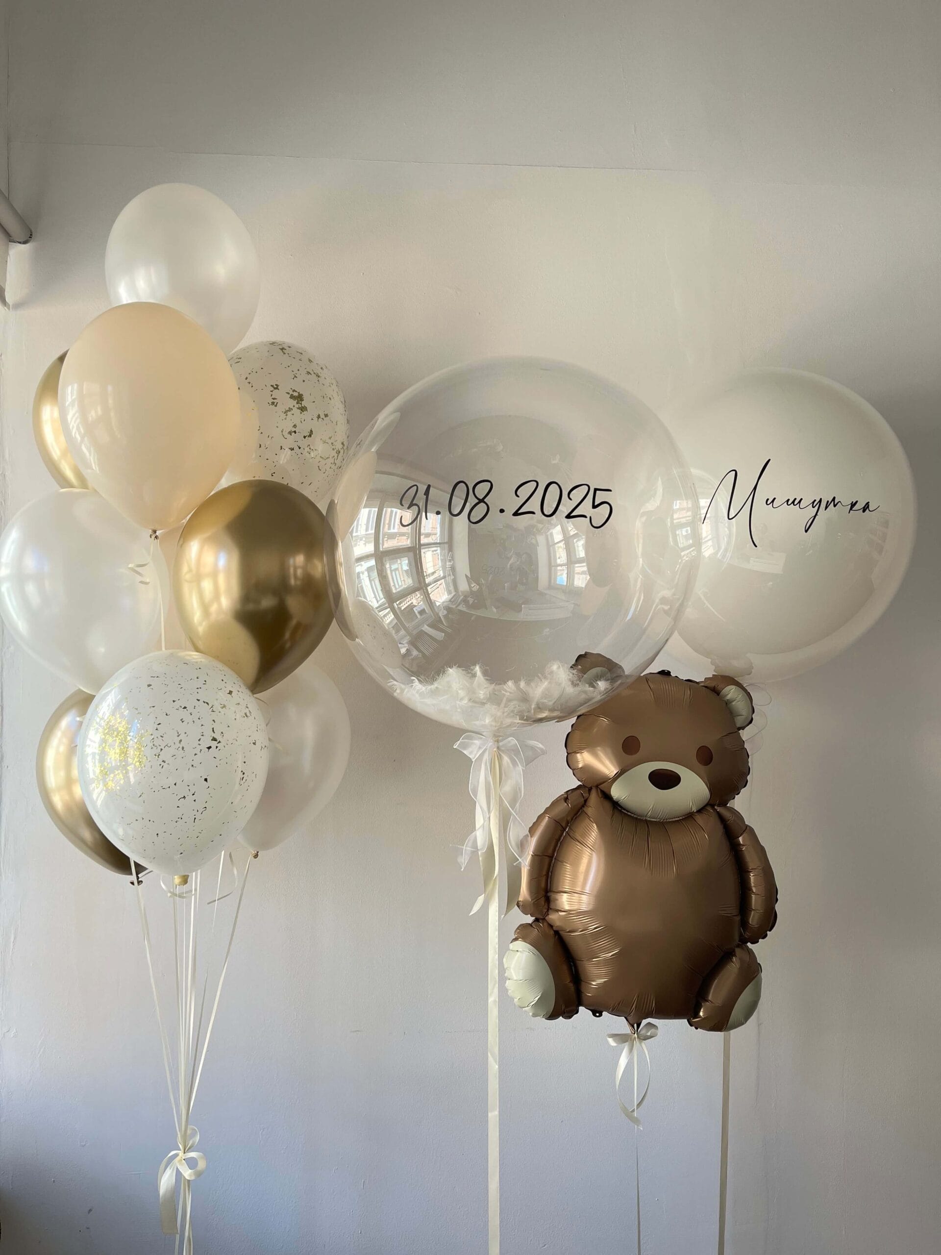 Całość uzupełniają balony lateksowe w jasnej, eleganckiej kolorystyce oraz foliowy balon w kształcie misia, który dodaje zestawowi uroku i dziecięcej czułości.